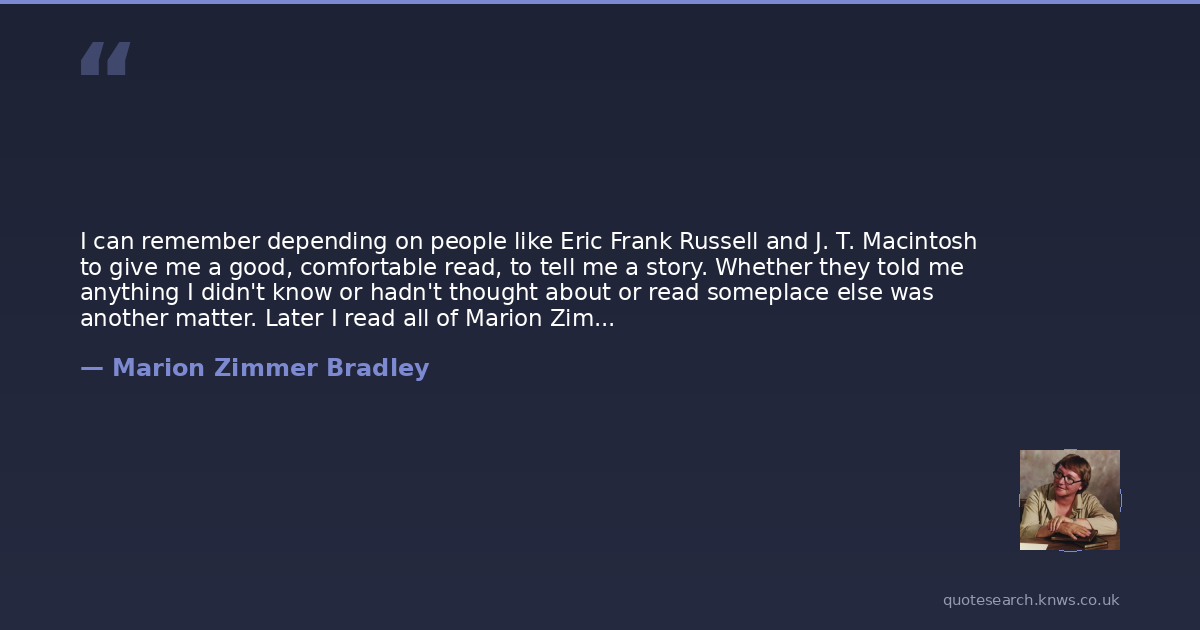 I can remember depending on people like Eric Frank Russell and J. T. Macintosh to give me a good, comfortable read, to tell me a story. Whether they told me anything I didn't know or hadn't thought about or read someplace else was another matter. Later I read all of Marion Zimmer Bradley's Darkover books.