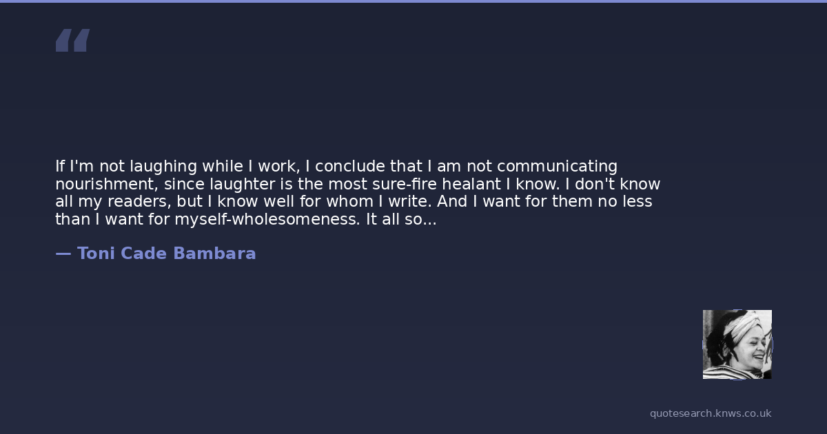 If I'm not laughing while I work, I conclude that I am not communicating nourishment, since laughter is the most sure-fire healant I know. I don't know all my readers, but I know well for whom I write. And I want for them no less than I want for myself-wholesomeness. It all sounds so la-di-da and tra-la-la. I can afford to be sunny. I'm but one voice in the chorus. The literature(s) of our time are a collective effort, dependent on so many views, on so many people's productions.
