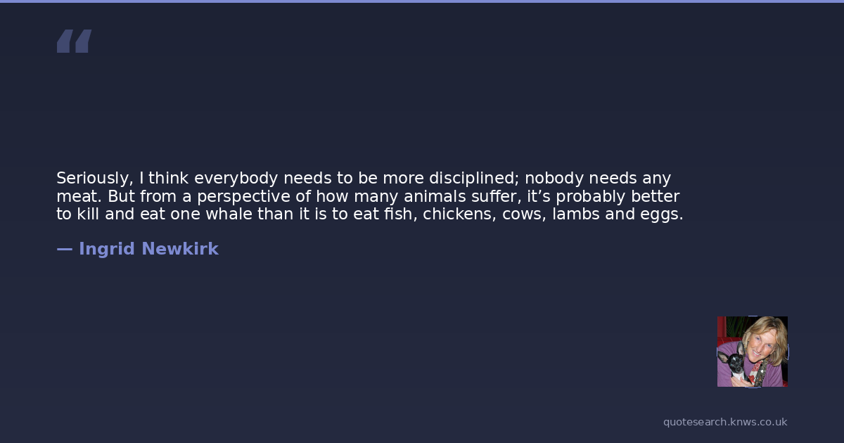 Seriously, I think everybody needs to be more disciplined; nobody needs any meat. But from a perspective of how many animals suffer, it’s probably better to kill and eat one whale than it is to eat fish, chickens, cows, lambs and eggs.