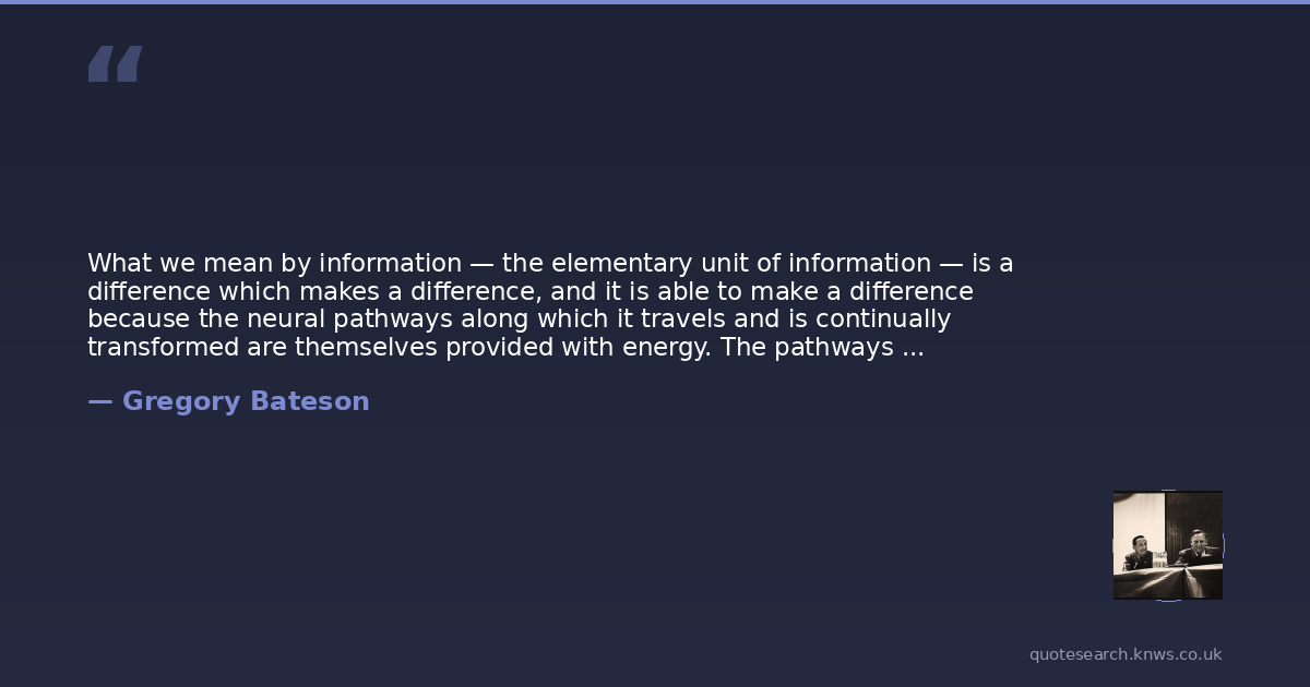 What we mean by information — the elementary unit of information — is a difference which makes a difference, and it is able to make a difference because the neural pathways along which it travels and is continually transformed are themselves provided with energy. The pathways are ready to be triggered. We may even say that the question is already implicit in them.