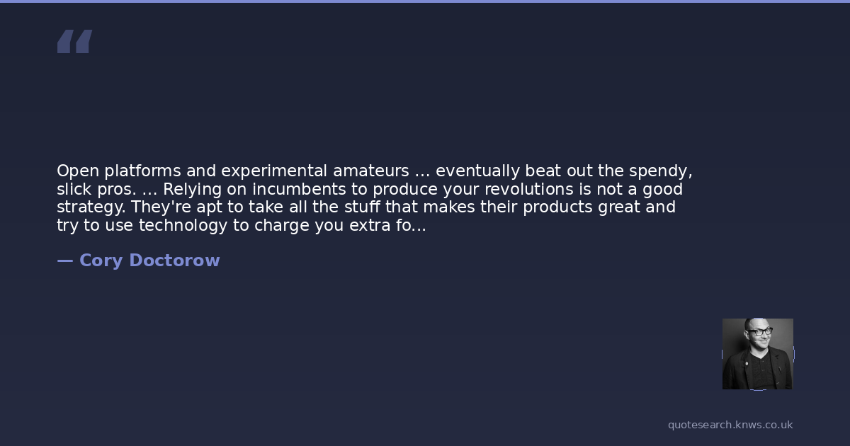 Open platforms and experimental amateurs … eventually beat out the spendy, slick pros. … Relying on incumbents to produce your revolutions is not a good strategy. They're apt to take all the stuff that makes their products great and try to use technology to charge you extra for it, or prohibit it altogether.