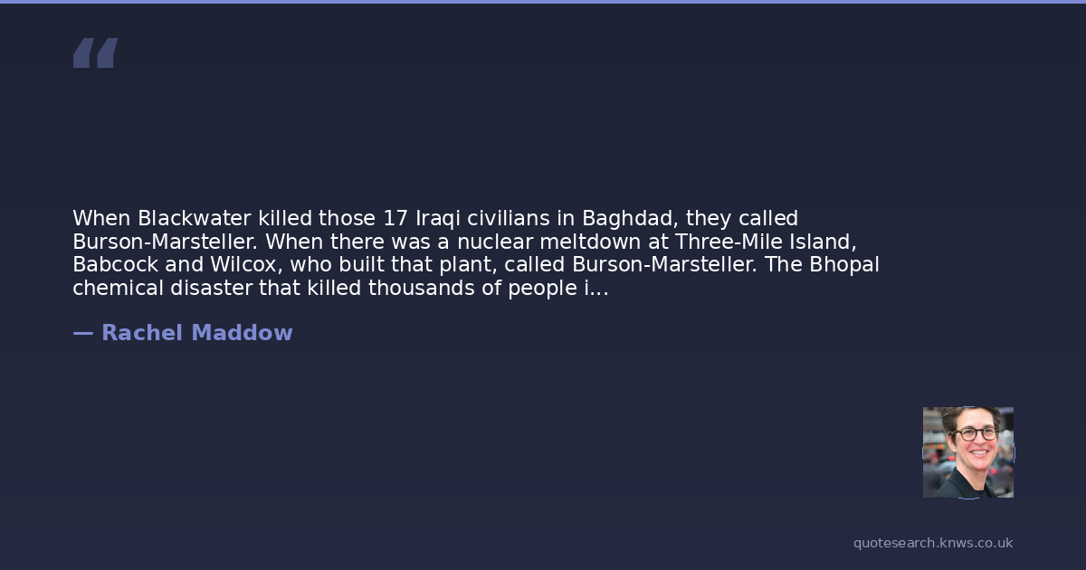 When Blackwater killed those 17 Iraqi civilians in Baghdad, they called Burson-Marsteller. When there was a nuclear meltdown at Three-Mile Island, Babcock and Wilcox, who built that plant, called Burson-Marsteller. The Bhopal chemical disaster that killed thousands of people in India, Union Carbide called Burson-Marsteller. Romanian dictator, Nicolae Ceausescu — Burson-Marsteller. The government of Saudi Arabia, three days after 9/11 — Burson-Marsteller.