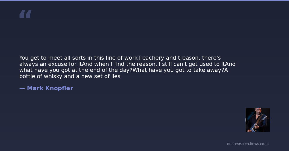 You get to meet all sorts in this line of workTreachery and treason, there's always an excuse for itAnd when I find the reason, I still can't get used to itAnd what have you got at the end of the day?What have you got to take away?A bottle of whisky and a new set of lies