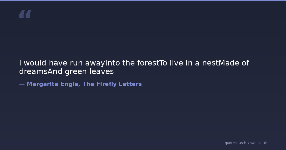 I would have run awayInto the forestTo live in a nestMade of dreamsAnd green leaves dreams freedom nature Download Image Share on X Share on Facebook Copy Link