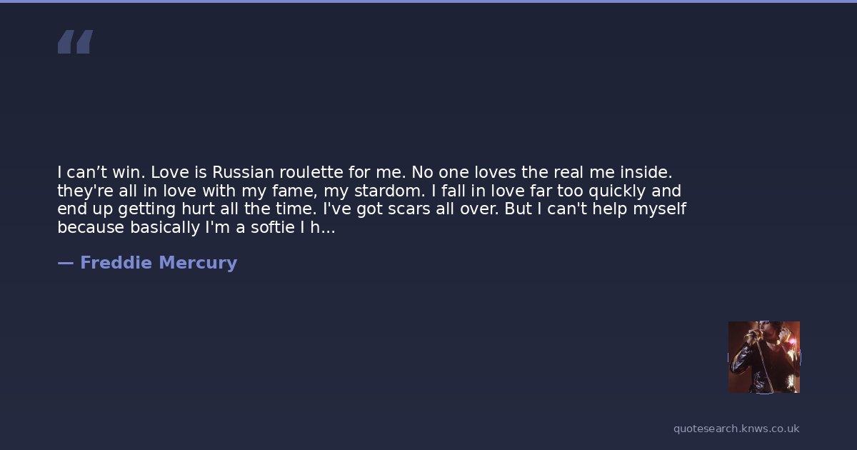 I can’t win. Love is Russian roulette for me. No one loves the real me inside. they're all in love with my fame, my stardom. I fall in love far too quickly and end up getting hurt all the time. I've got scars all over. But I can't help myself because basically I'm a softie I have this hard, macho shell — which I project on stage but there's a much softer side. too, which melts like butter.