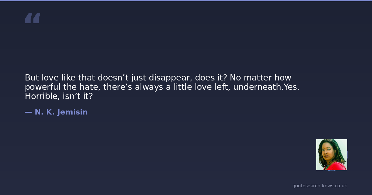 But love like that doesn’t just disappear, does it? No matter how powerful the hate, there’s always a little love left, underneath.Yes. Horrible, isn’t it?