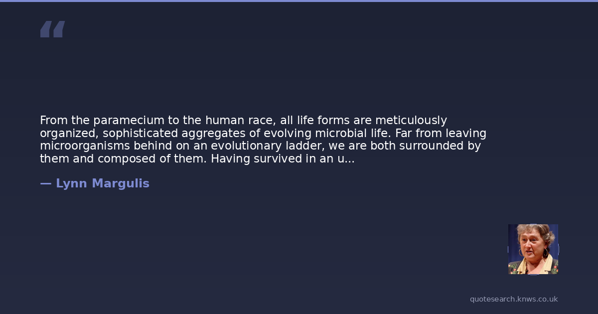 From the paramecium to the human race, all life forms are meticulously organized, sophisticated aggregates of evolving microbial life. Far from leaving microorganisms behind on an evolutionary ladder, we are both surrounded by them and composed of them. Having survived in an unbroken line from the beginnings of life, all organisms today are equally evolved.