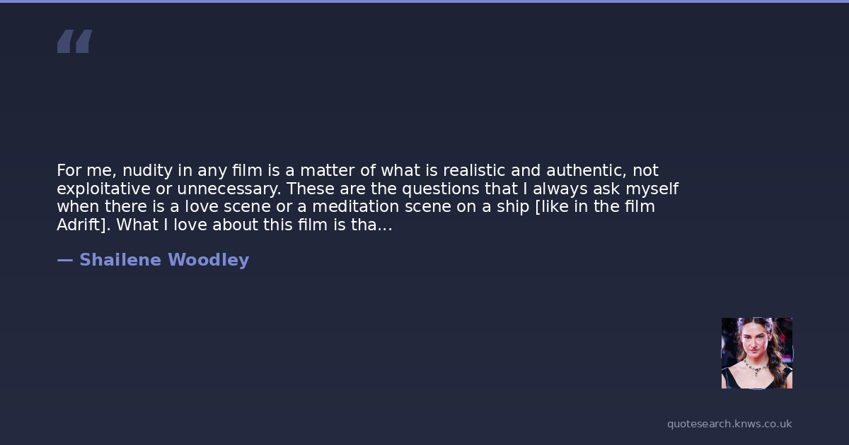 For me, nudity in any film is a matter of what is realistic and authentic, not exploitative or unnecessary. These are the questions that I always ask myself when there is a love scene or a meditation scene on a ship [like in the film Adrift]. What I love about this film is that we explore sensuality in so many moments without needing any sexuality at all. The more we're able to capture sensual moments on screen the more we can start changing our view when it comes to our personal sexualities and sensualities. In a personal way, I find less to be more in most cases and I think leaving things up to the imagination leaves a little mystery when it comes to nudity or sex. It only intrigues the audience more.