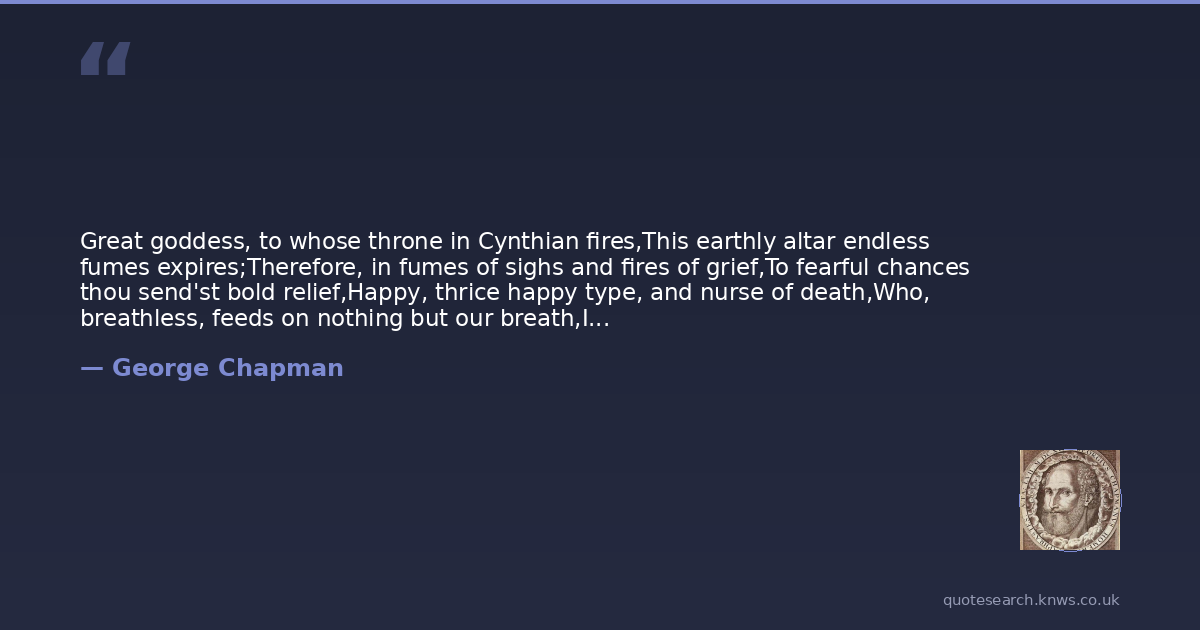Great goddess, to whose throne in Cynthian fires,This earthly altar endless fumes expires;Therefore, in fumes of sighs and fires of grief,To fearful chances thou send'st bold relief,Happy, thrice happy type, and nurse of death,Who, breathless, feeds on nothing but our breath,In whom must virtue and her issue live,Or die for ever.