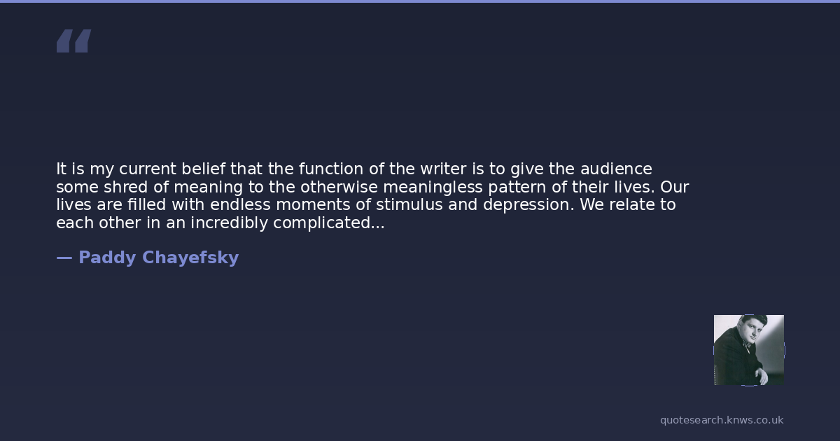 It is my current belief that the function of the writer is to give the audience some shred of meaning to the otherwise meaningless pattern of their lives. Our lives are filled with endless moments of stimulus and depression. We relate to each other in an incredibly complicated manner. Every fiber of relationship is worth a dramatic study. There is far more exciting drama in the reasons why a man gets married than in why he murders someone. The man who is unhappy in his job, the wife who thinks of a lover, the girl who wants to get into television, your father, mother, sister, brothers, cousins, friends - all these are better subjects for drama than Iago. What makes a man ambitious? Why does one girl always try to steal her kid sister's boy friends? Why does your uncle attend his annual class reunion faithfully every year? Why do you always find it depressing to visit your father? These are the substances of good television drama; and the deeper you probe into and examine the twisted semiformed complexes of emotional entanglements, the more exciting your writing becomes.