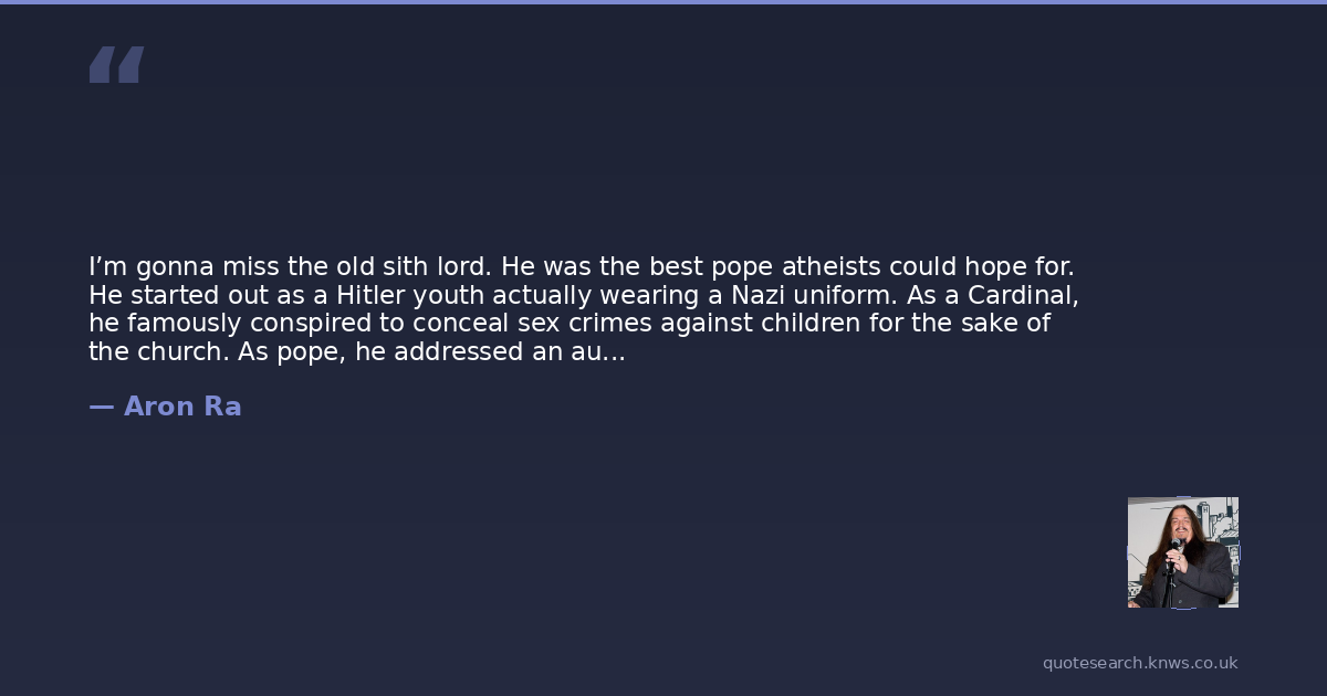 I’m gonna miss the old sith lord. He was the best pope atheists could hope for. He started out as a Hitler youth actually wearing a Nazi uniform. As a Cardinal, he famously conspired to conceal sex crimes against children for the sake of the church. As pope, he addressed an audience in an AIDS ravaged area of Africa, and told them that use of condoms actually increased risk of STDs. His objection to birth-control took precedence over human life. That is how evil he is.