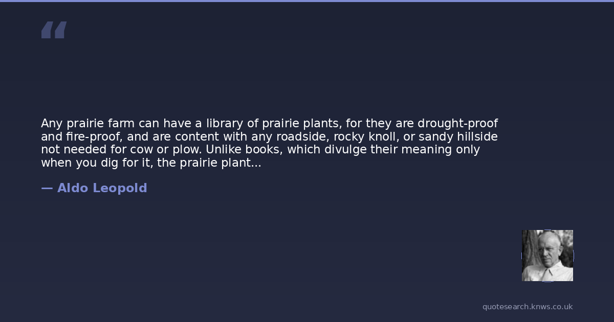Any prairie farm can have a library of prairie plants, for they are drought-proof and fire-proof, and are content with any roadside, rocky knoll, or sandy hillside not needed for cow or plow. Unlike books, which divulge their meaning only when you dig for it, the prairie plants yearly repeat their story, in technicolor, from the first pale blooms of pasque in April to the wine-red plumes of bluestem in the fall. All but the blind may read, and gather from the reading new lessons in the meaning of America.