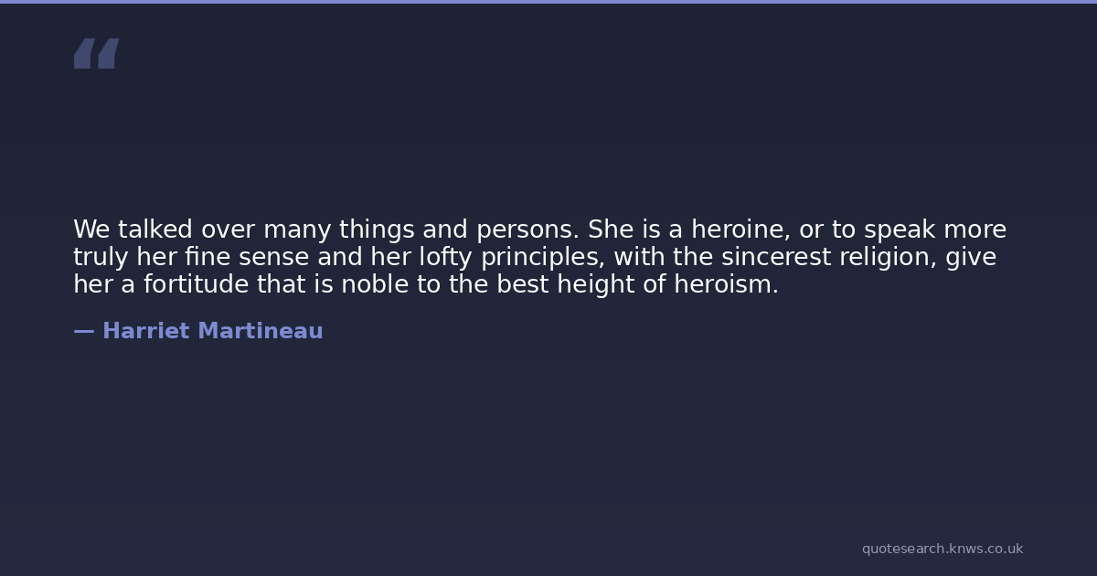 We talked over many things and persons. She is a heroine, or to speak more truly her fine sense and her lofty principles, with the sincerest religion, give her a fortitude that is noble to the best height of heroism.