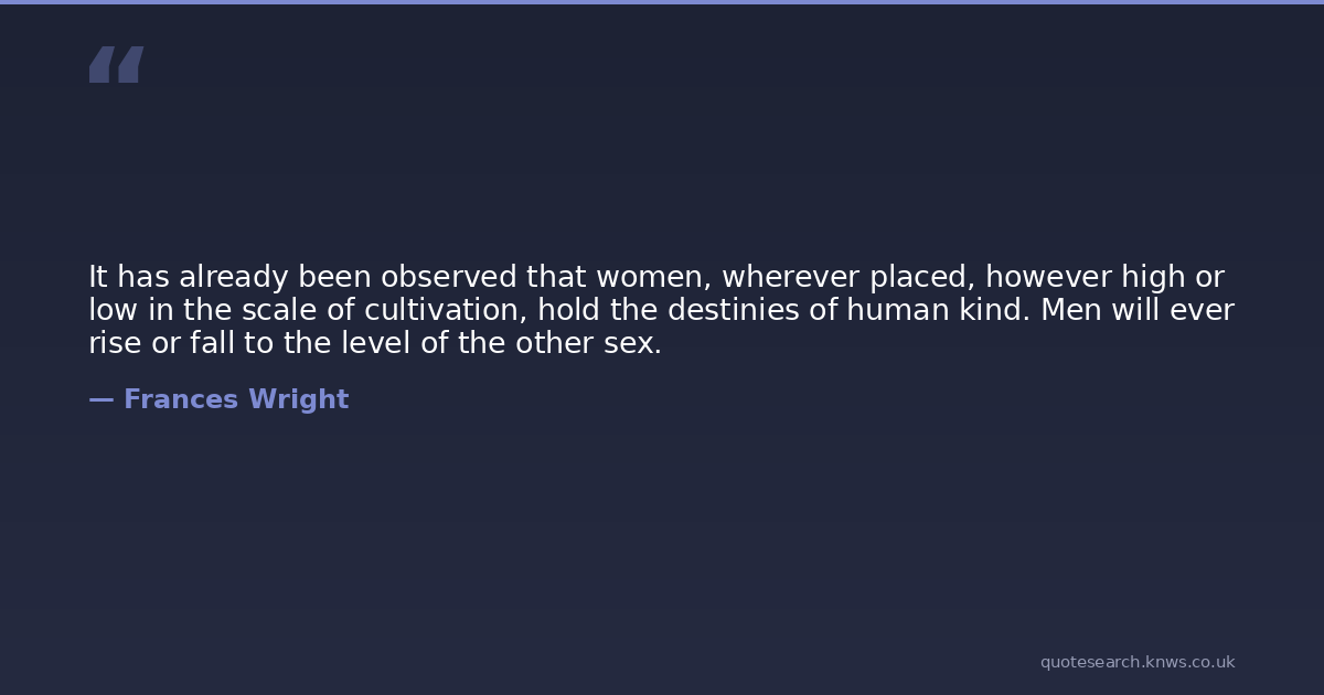 It has already been observed that women, wherever placed, however high or low in the scale of cultivation, hold the destinies of human kind. Men will ever rise or fall to the level of the other sex.