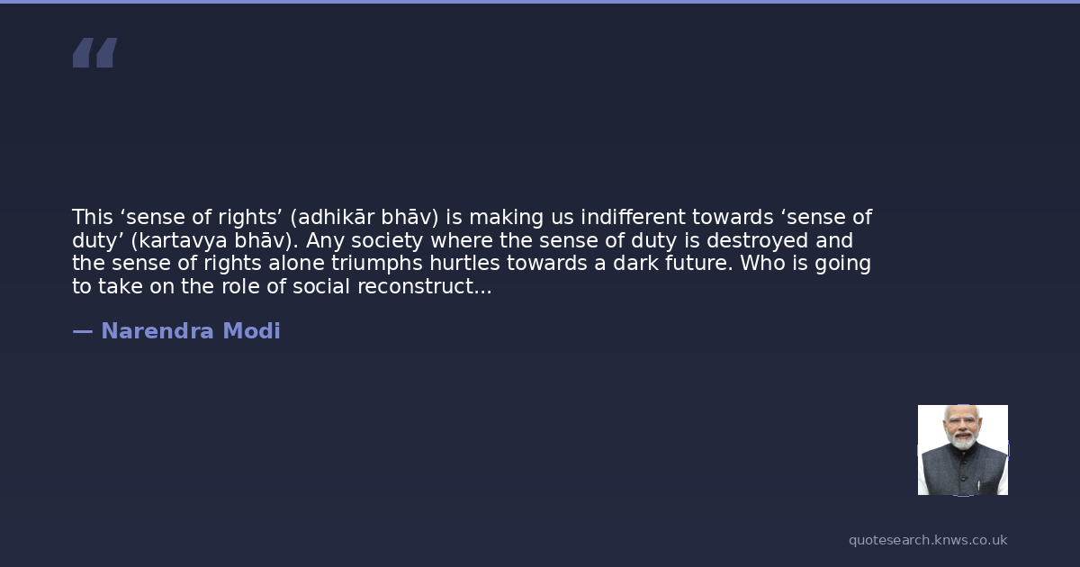 This ‘sense of rights’ (adhikār bhāv) is making us indifferent towards ‘sense of duty’ (kartavya bhāv). Any society where the sense of duty is destroyed and the sense of rights alone triumphs hurtles towards a dark future. Who is going to take on the role of social reconstruction? It is not possible for politicians to undertake this task. The sants of our raṣṭra (nation), the gurukūl tradition of our raṣṭra, the acharyas of our raṣṭra have to nurture a new generation, which combines self-confidence with a sense of duty. If we cultivate these two qualities, the strength emanating from them will shape the future history of our society....