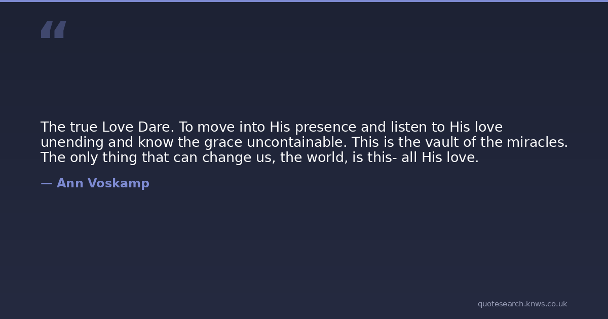 The true Love Dare. To move into His presence and listen to His love unending and know the grace uncontainable. This is the vault of the miracles. The only thing that can change us, the world, is this- all His love.
