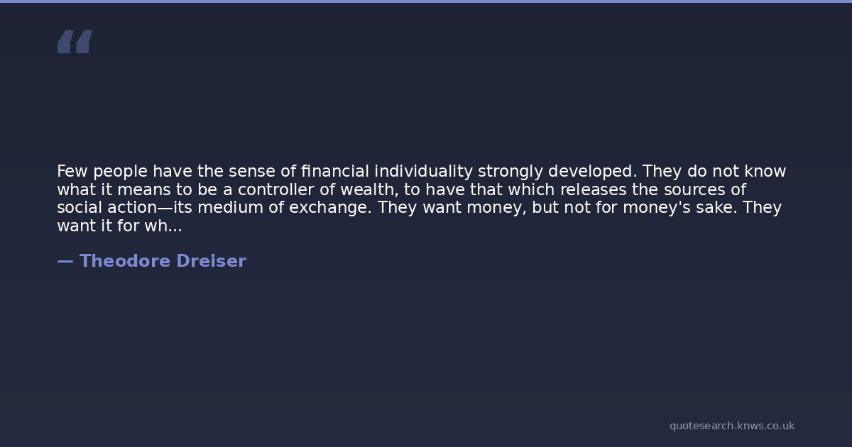 Few people have the sense of financial individuality strongly developed. They do not know what it means to be a controller of wealth, to have that which releases the sources of social action—its medium of exchange. They want money, but not for money's sake. They want it for what it will buy in the way of simple comforts, whereas the financier wants it for what it will control—for what it will represent in the way of dignity, force, power.