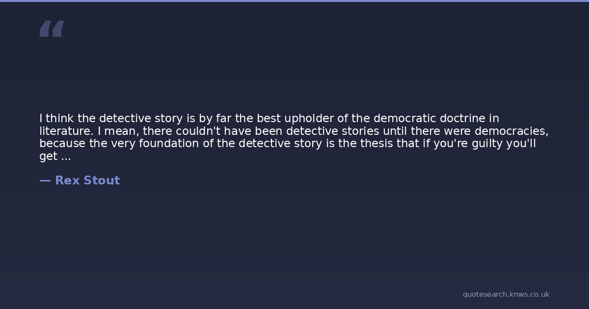 I think the detective story is by far the best upholder of the democratic doctrine in literature. I mean, there couldn't have been detective stories until there were democracies, because the very foundation of the detective story is the thesis that if you're guilty you'll get it in the neck and if you're innocent you can't possibly be harmed. No matter who you are. There was no such conception of justice until after 1830. There was no such thing as a policeman or a detective in the world before 1830, because the modern conception of the policeman and detective, namely, a man whose only function is to find out who did it and then get the evidence that will punish him, did not exist. ... In Paris before the year 1800 – read the Dumas stories – there were gangs of people whose business was to go out and punish wrongdoers. But why? Because they had hurt De Marillac or Richelieu or the Duke or some Huguenot noble, not just because they had harmed society. It is only the modern policeman that is out to protect society.
