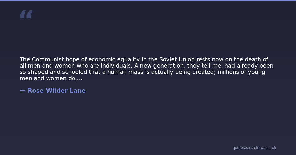 The Communist hope of economic equality in the Soviet Union rests now on the death of all men and women who are individuals. A new generation, they tell me, had already been so shaped and schooled that a human mass is actually being created; millions of young men and women do, in veritable fact, have the psychology of the bee-swarm, the ant-hill.