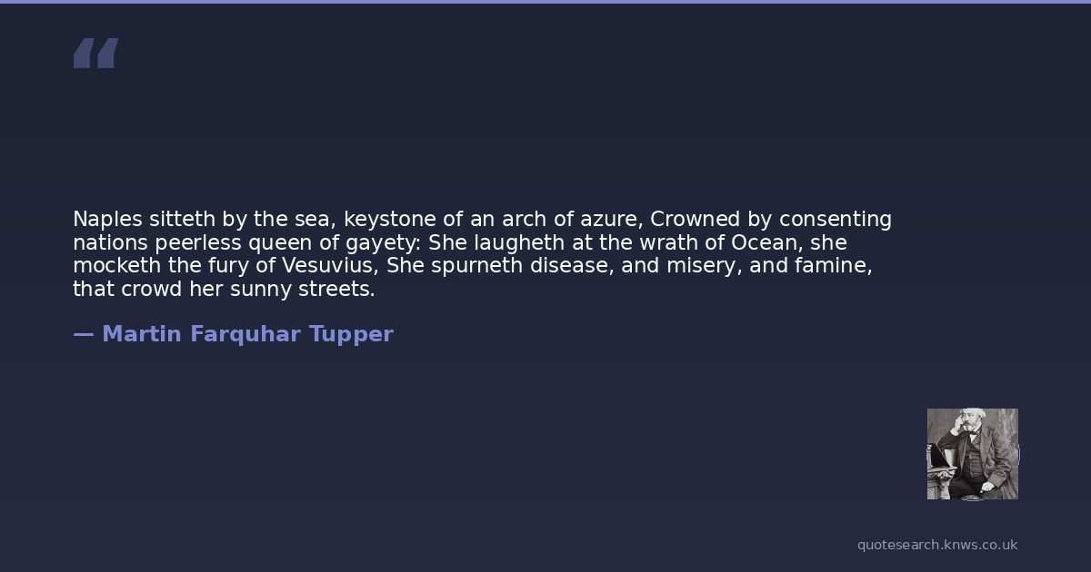 Naples sitteth by the sea, keystone of an arch of azure, Crowned by consenting nations peerless queen of gayety: She laugheth at the wrath of Ocean, she mocketh the fury of Vesuvius, She spurneth disease, and misery, and famine, that crowd her sunny streets.