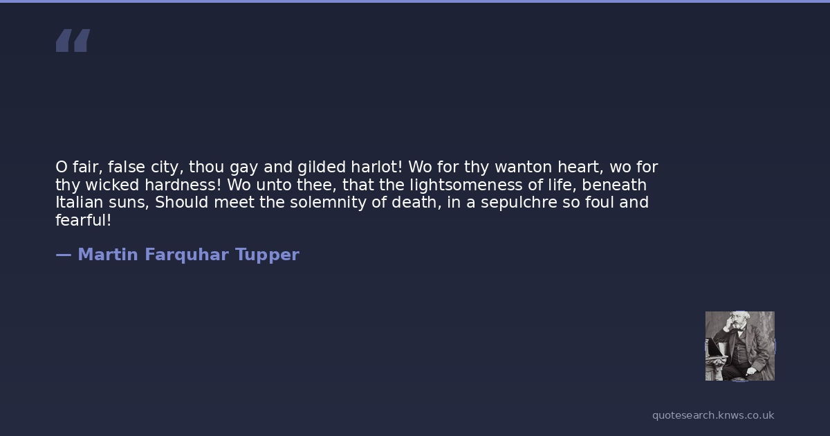 O fair, false city, thou gay and gilded harlot! Wo for thy wanton heart, wo for thy wicked hardness! Wo unto thee, that the lightsomeness of life, beneath Italian suns, Should meet the solemnity of death, in a sepulchre so foul and fearful!