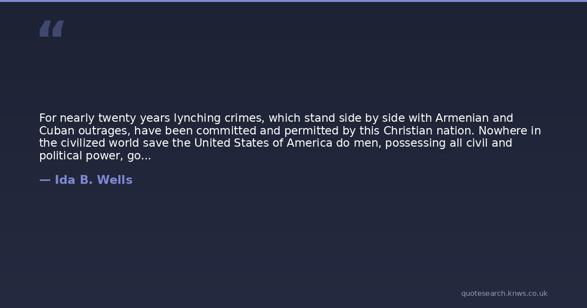 Ida B. Wells was a 19th-century American journalist and civil rights activist. Ida Bell Wells-Barnett was an American investigative journalist, sociologist, educator, and early leader in the civil rights movement. She was one of the founders of the National Association for the Advancement of Colored People (NAACP). Read more on Wikipedia →