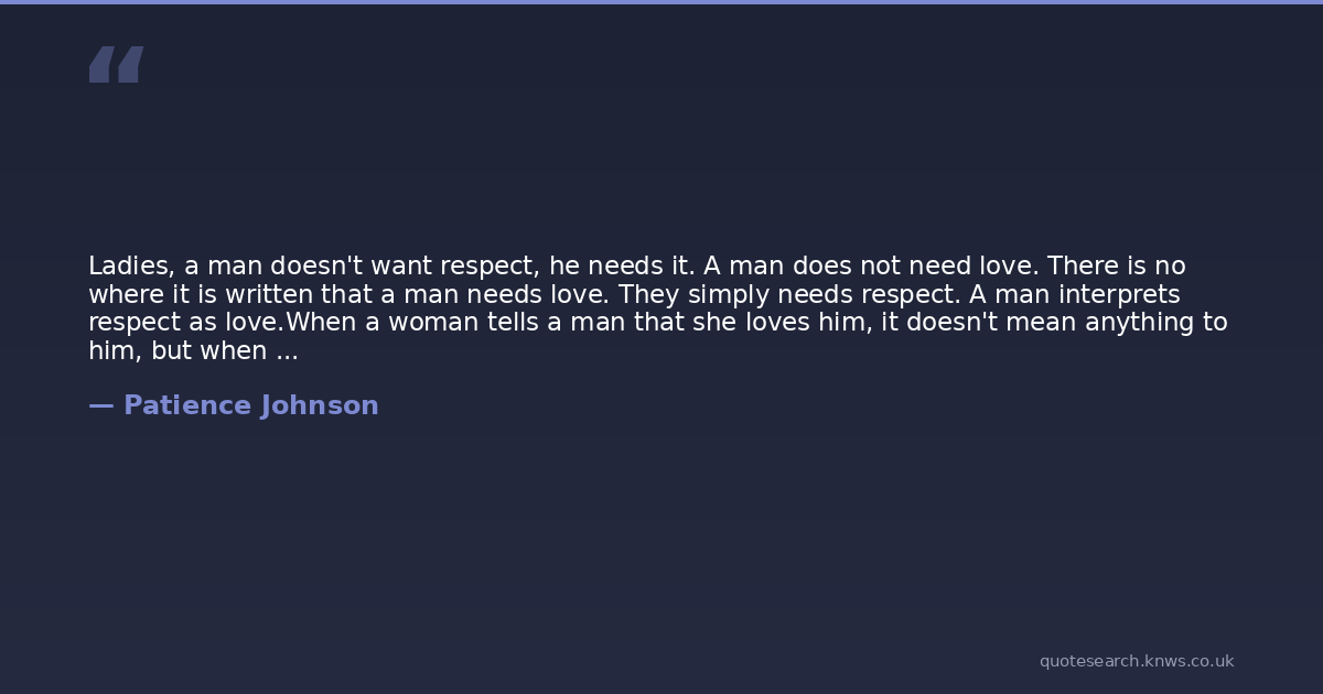 Ladies, a man doesn't want respect, he needs it. A man does not need love. There is no where it is written that a man needs love. They simply needs respect. A man interprets respect as love.When a woman tells a man that she loves him, it doesn't mean anything to him, but when a man knows you respects him, that means a whole lot to him.