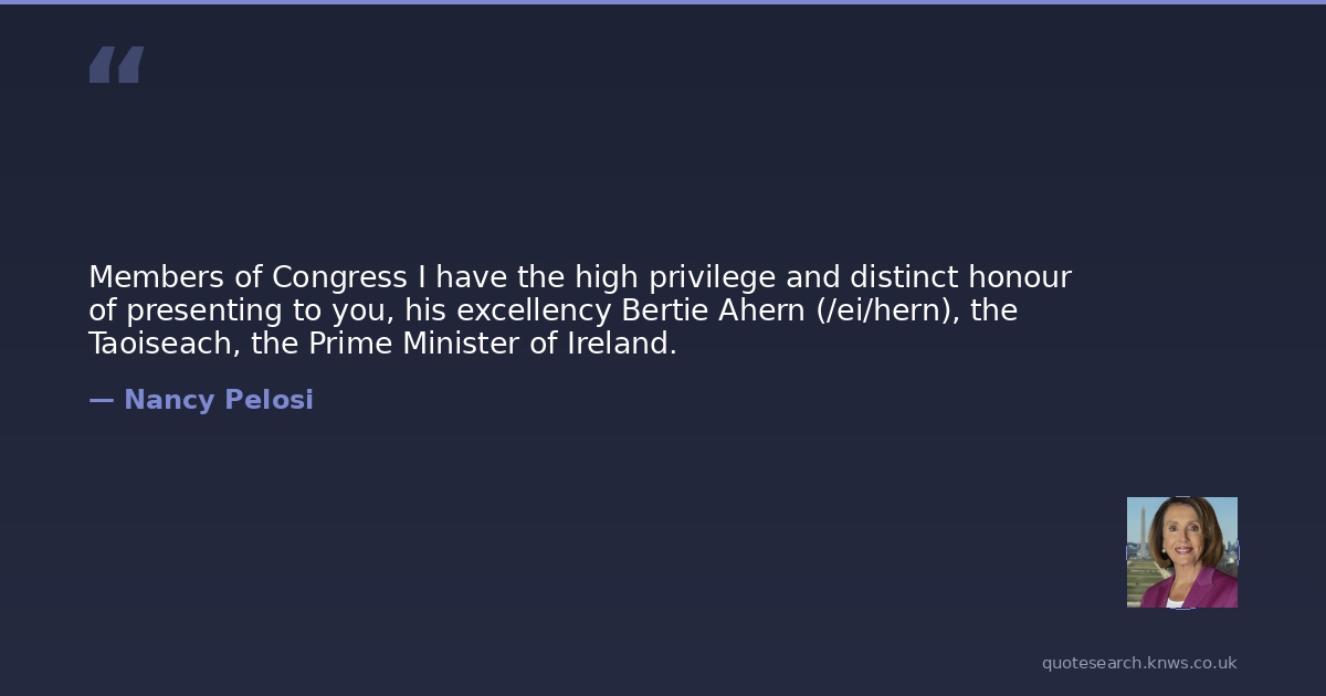 Members of Congress I have the high privilege and distinct honour of presenting to you, his excellency Bertie Ahern (/ei/hern), the Taoiseach, the Prime Minister of Ireland.