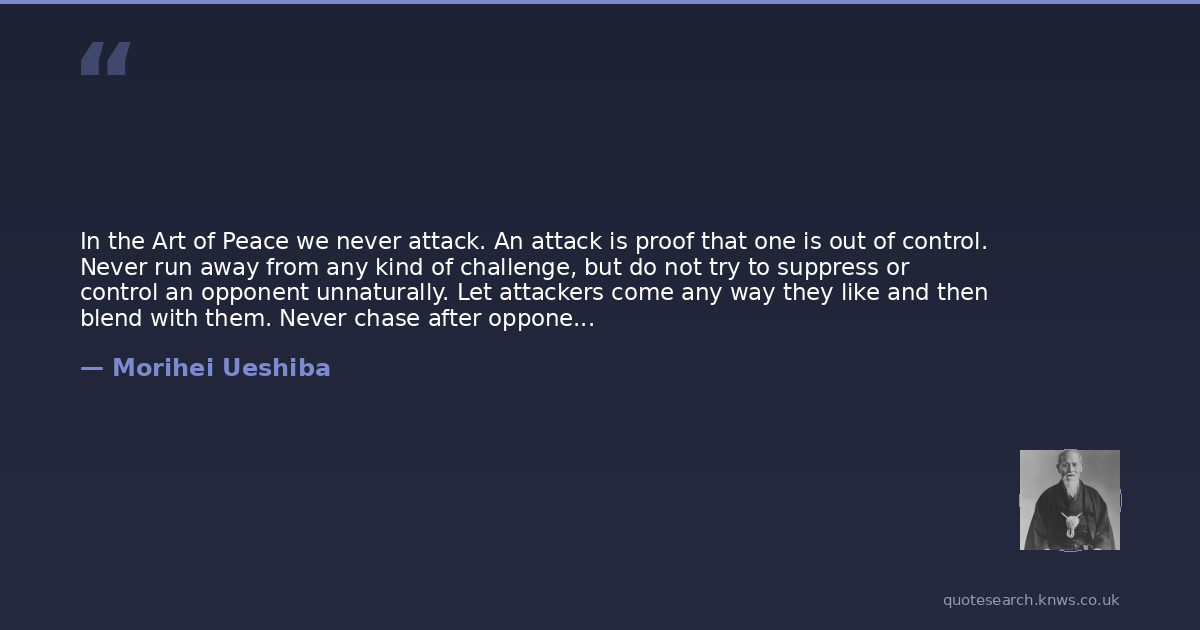 In the Art of Peace we never attack. An attack is proof that one is out of control. Never run away from any kind of challenge, but do not try to suppress or control an opponent unnaturally. Let attackers come any way they like and then blend with them. Never chase after opponents. Redirect each attack and get firmly behind it.