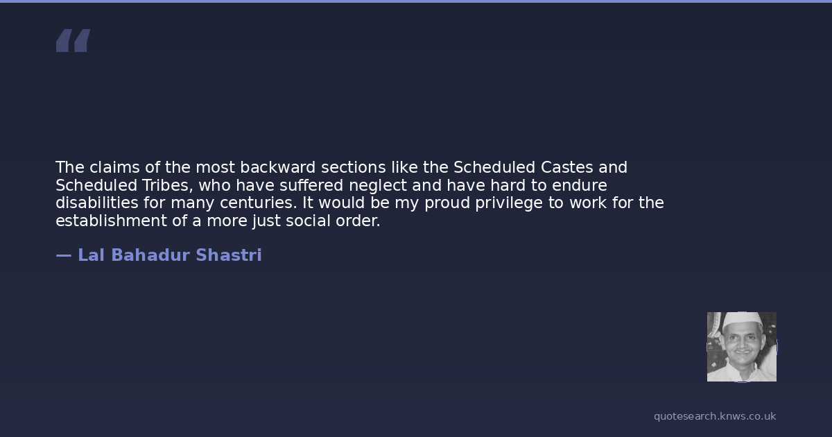 The claims of the most backward sections like the Scheduled Castes and Scheduled Tribes, who have suffered neglect and have hard to endure disabilities for many centuries. It would be my proud privilege to work for the establishment of a more just social order.