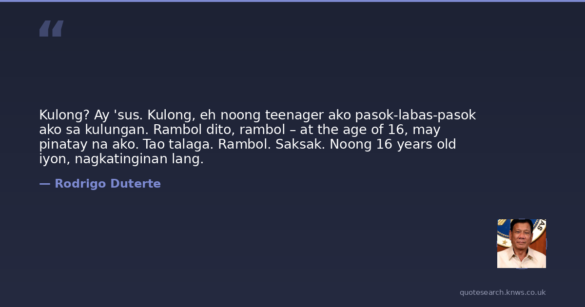 Kulong? Ay 'sus. Kulong, eh noong teenager ako pasok-labas-pasok ako sa kulungan. Rambol dito, rambol – at the age of 16, may pinatay na ako. Tao talaga. Rambol. Saksak. Noong 16 years old iyon, nagkatinginan lang.