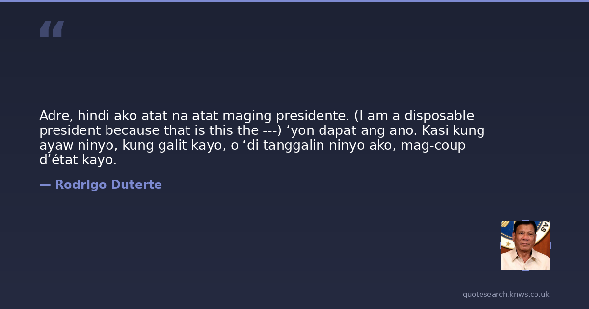 Adre, hindi ako atat na atat maging presidente. (I am a disposable president because that is this the ---) ‘yon dapat ang ano. Kasi kung ayaw ninyo, kung galit kayo, o ‘di tanggalin ninyo ako, mag-coup d’état kayo.