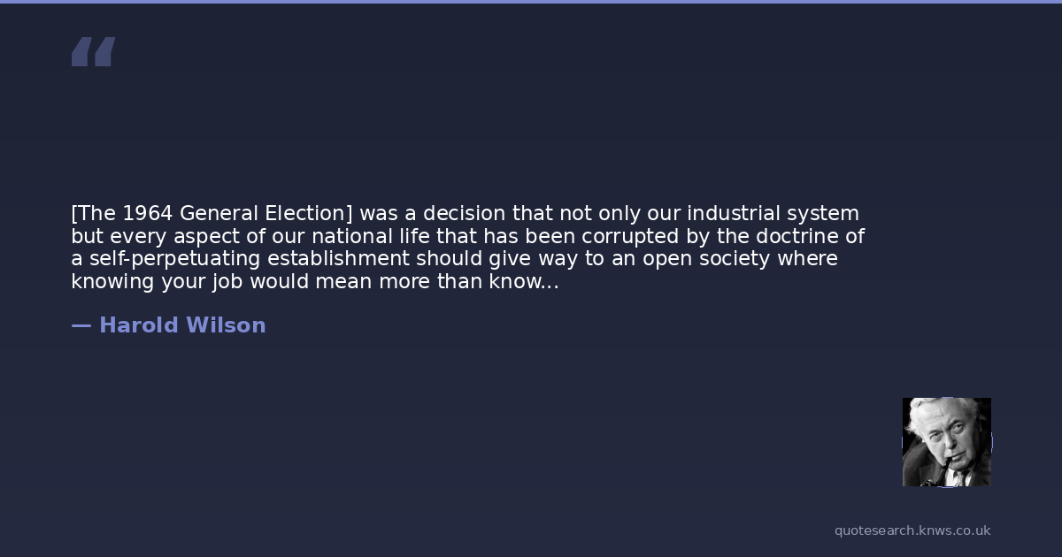 [The 1964 General Election] was a decision that not only our industrial system but every aspect of our national life that has been corrupted by the doctrine of a self-perpetuating establishment should give way to an open society where knowing your job would mean more than knowing the right people. It was a decision that national purpose should override sectional interest, that earning money took precedence over making money. It was a decision for change: not change for its own sake, but change, radical and dynamic, for economic and social purpose. It was a decision, in short, that Britain should have a government and that the government should govern.