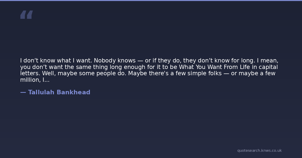 I don’t know what I want. Nobody knows — or if they do, they don’t know for long. I mean, you don’t want the same thing long enough for it to be What You Want From Life in capital letters. Well, maybe some people do. Maybe there's a few simple folks — or maybe a few million, I don't know — who fix their hearts, and their minds, and their everlasting souls on a thing, and keep on all their lives hoping for it. Living for it. Wanting It From Life. But these are the people who never get it.
