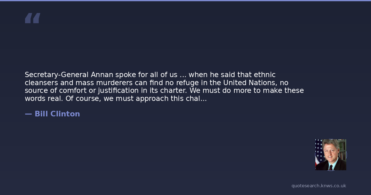 Secretary-General Annan spoke for all of us ... when he said that ethnic cleansers and mass murderers can find no refuge in the United Nations, no source of comfort or justification in its charter. We must do more to make these words real. Of course, we must approach this challenge with some considerable degree of humility. It is easy to say, Never again, but much harder to make it so. Promising too much can be as cruel as caring too little. But difficulties, dangers, and costs are not an argument for doing nothing. When we are faced with deliberate, organized campaigns to murder whole peoples or expel them from their land, the care of victims is important but not enough. We should work to end the violence.