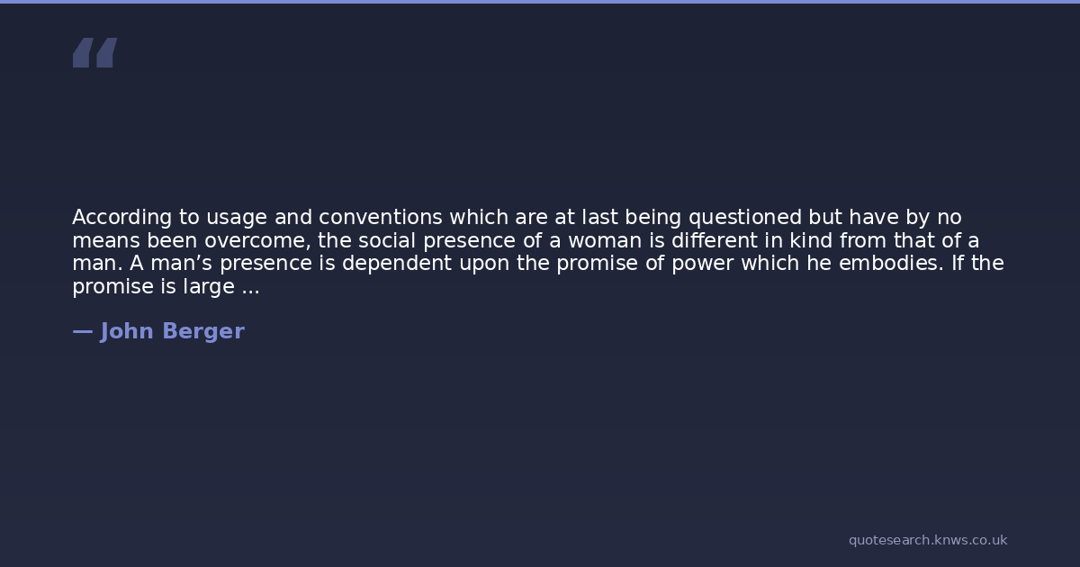 According to usage and conventions which are at last being questioned but have by no means been overcome, the social presence of a woman is different in kind from that of a man. A man’s presence is dependent upon the promise of power which he embodies. If the promise is large and credible his presence is striking. If it is small or incredible, he is found to have little presence. The promised power may be moral, physical, temperamental, economic, social, sexual – but its object is always exterior to the man. A man’s presence suggests what he is capable of doing to you or for you. His presence may be fabricated, in the sense that he pretends to be capable of what he is not. But the pretence is always towards a power which he exercises on others.By contrast, a woman’s presence expresses her own attitude to herself, and defines what can and cannot be done to her. Her presence is manifest in her gestures, voice, opinions, expressions, clothes, chosen surroundings, taste – indeed there is nothing she can do which does not contribute to her presence. Presence for a woman is so intrinsic to her person that men tend to think of it as an almost physical emanation, a kind of heat or smell or aura.