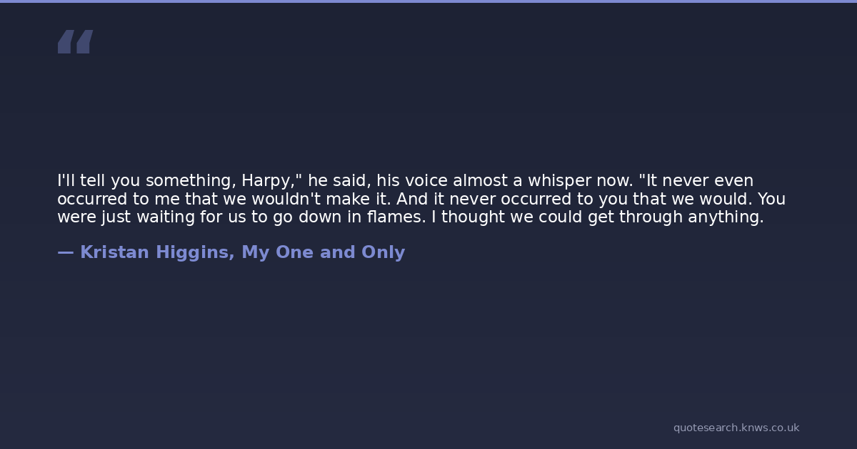 I'll tell you something, Harpy," he said, his voice almost a whisper now. "It never even occurred to me that we wouldn't make it. And it never occurred to you that we would. You were just waiting for us to go down in flames. I thought we could get through anything.