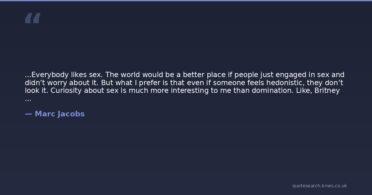 ...Everybody likes sex. The world would be a better place if people just engaged in sex and didn’t worry about it. But what I prefer is that even if someone feels hedonistic, they don’t look it. Curiosity about sex is much more interesting to me than domination. Like, Britney and Paris and Pamela might be someone’s definition of sexy, but they’re not mine. My clothes are not hot. Never. Never.