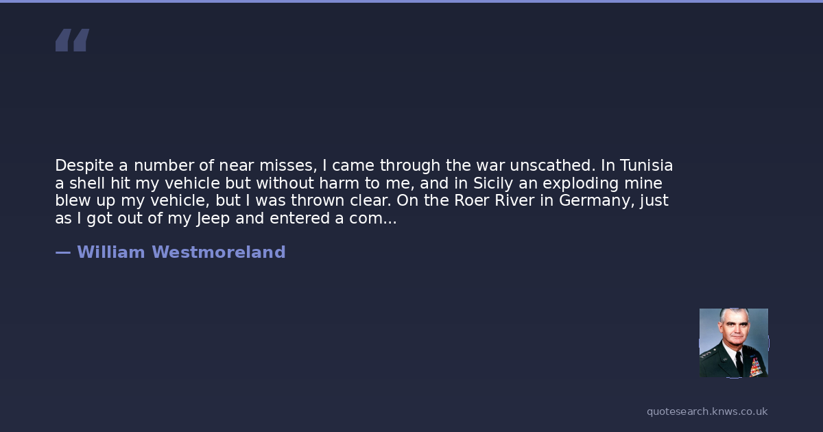 Despite a number of near misses, I came through the war unscathed. In Tunisia a shell hit my vehicle but without harm to me, and in Sicily an exploding mine blew up my vehicle, but I was thrown clear. On the Roer River in Germany, just as I got out of my Jeep and entered a company command post, a mortar shell struck my vehicle. In the Remagen bridgehead on the Rhine a shell demolished a latrine moments after I had departed. Somehow none of the enemy shells had my number.