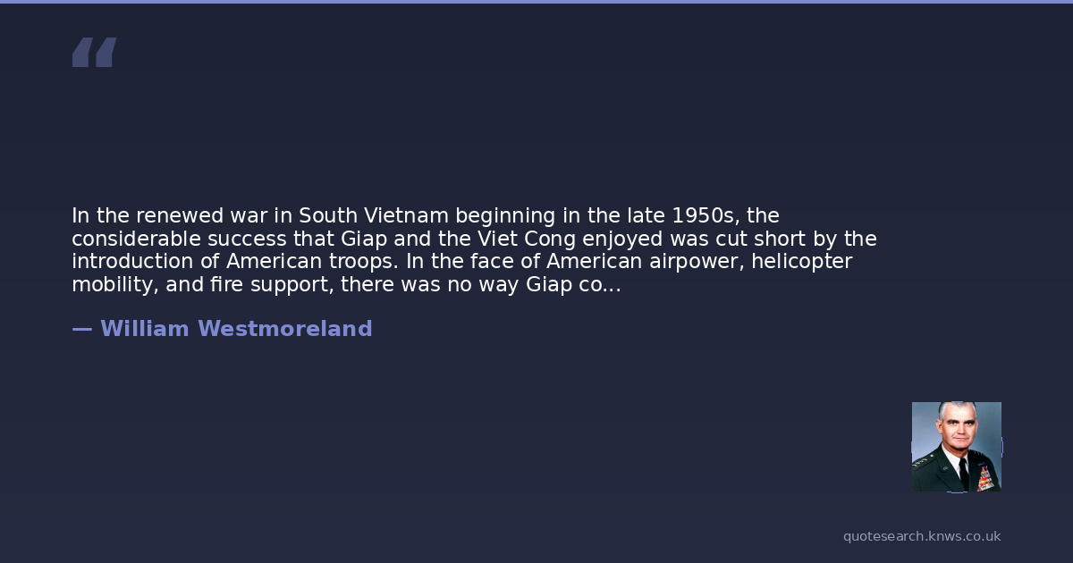 In the renewed war in South Vietnam beginning in the late 1950s, the considerable success that Giap and the Viet Cong enjoyed was cut short by the introduction of American troops. In the face of American airpower, helicopter mobility, and fire support, there was no way Giap could win on the battlefield. Given the restrictions they had imposed on themselves, neither was there much chance that the Americans and South Vietnamese could win a conventional victory; but so long as American troops were involved, Giap could point to few battlefield successes more spectacular or meaningful than the occasional overrunning of a fire-support base. Yet Giap persisted nevertheless in a big-unit war in which his losses were appalling, as evidenced by his admission to the Italian journalist Oriana Fallaci that he had by early 1969 lost half a million men killed. Ruthless disregard for losses is seldom seen as military genius. A Western commander absorbing losses on the scale of Giap's would have hardly lasted in command more than a few weeks.