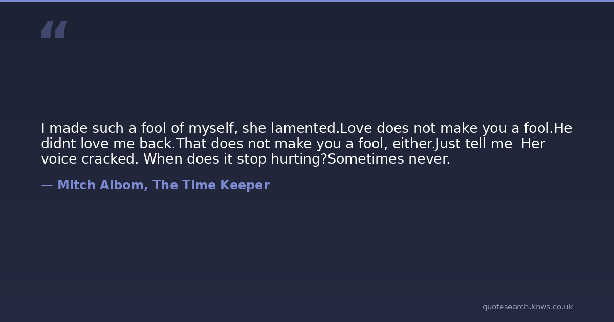 I made such a fool of myself, she lamented.Love does not make you a fool.He didnt love me back.That does not make you a fool, either.Just tell me Her voice cracked. When does it stop hurting?Sometimes never.