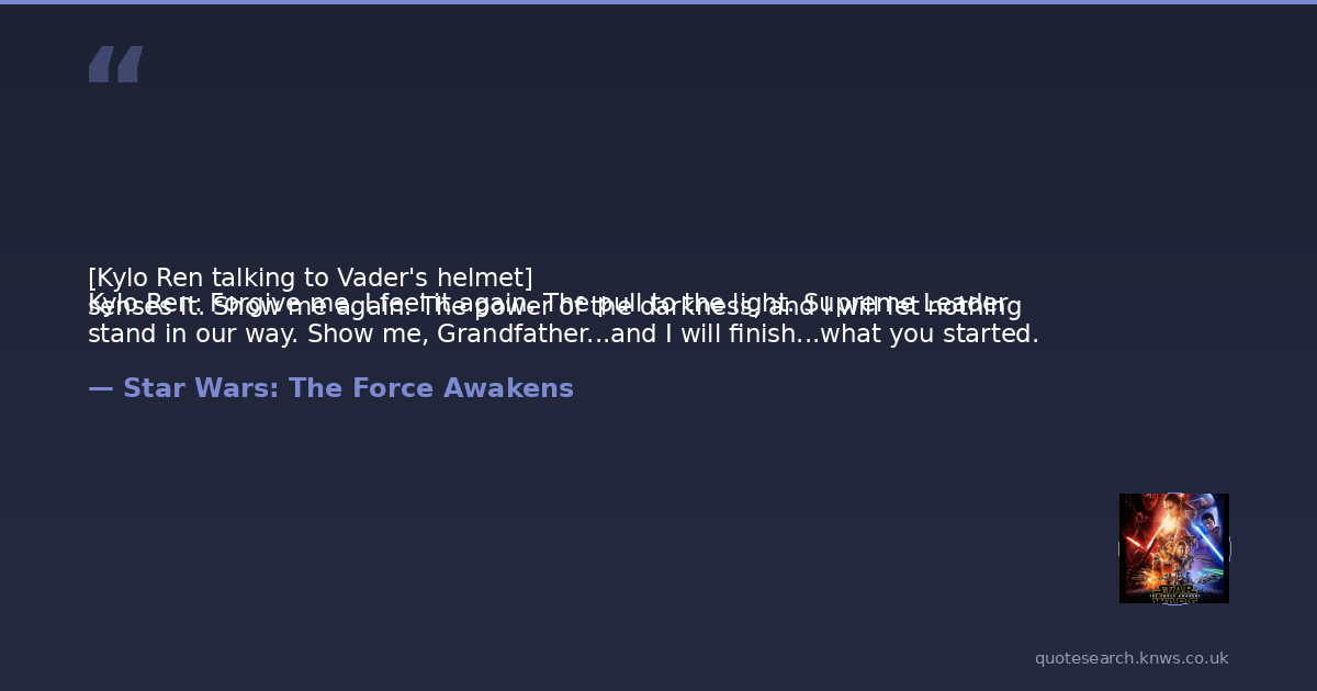 [Kylo Ren talking to Vader's helmet] Kylo Ren: Forgive me. I feel it again. The pull to the light. Supreme Leader senses it. Show me again. The power of the darkness, and I will let nothing stand in our way. Show me, Grandfather...and I will finish...what you started.
