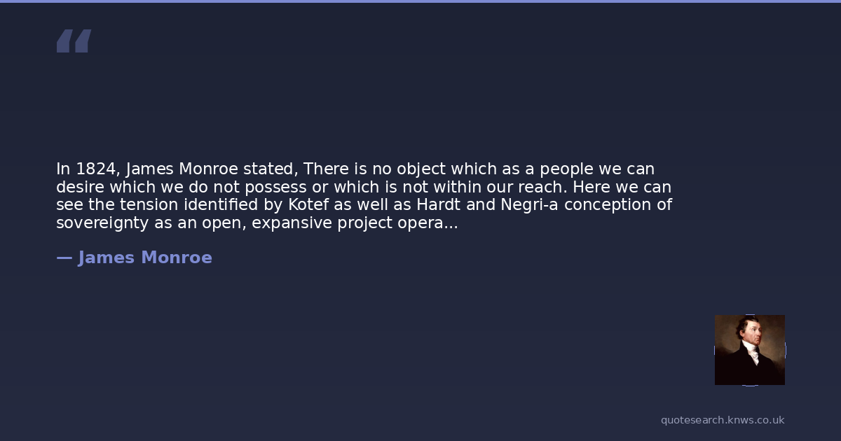 In 1824, James Monroe stated, There is no object which as a people we can desire which we do not possess or which is not within our reach. Here we can see the tension identified by Kotef as well as Hardt and Negri-a conception of sovereignty as an open, expansive project operating on unbounded terrain that exists alongside a fantasy of closure and enclosure, involving clearly demarcated territory, sealed within a border, which is a container of the people. Here we see that for certain subjects, movement is a manifestation of liberty that should be maximized. While for others, movement is something that must be tightly managed and regulated.