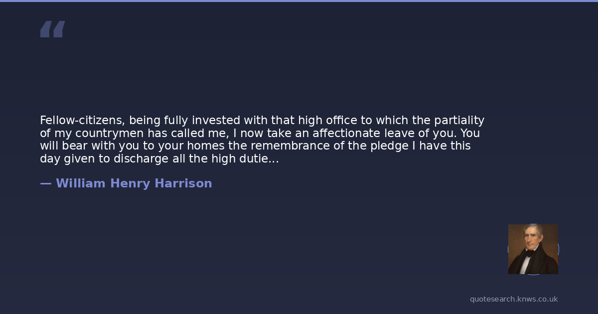 Fellow-citizens, being fully invested with that high office to which the partiality of my countrymen has called me, I now take an affectionate leave of you. You will bear with you to your homes the remembrance of the pledge I have this day given to discharge all the high duties of my exalted station according to the best of my ability, and I shall enter upon their performance with entire confidence in the support of a just and generous people.