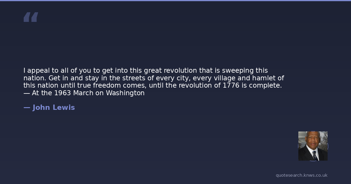 I appeal to all of you to get into this great revolution that is sweeping this nation. Get in and stay in the streets of every city, every village and hamlet of this nation until true freedom comes, until the revolution of 1776 is complete. — At the 1963 March on Washington