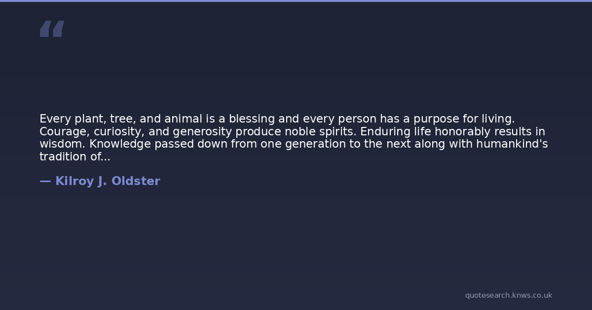 Every plant, tree, and animal is a blessing and every person has a purpose for living. Courage, curiosity, and generosity produce noble spirits. Enduring life honorably results in wisdom. Knowledge passed down from one generation to the next along with humankind's tradition of performing charitable and self-sacrificing deeds creates principled legacies for future generations to emulate.