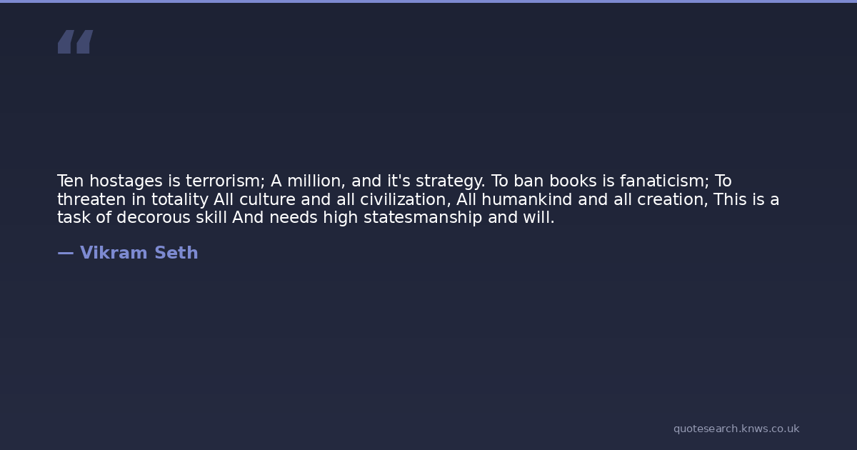 Ten hostages is terrorism; A million, and it's strategy. To ban books is fanaticism; To threaten in totality All culture and all civilization, All humankind and all creation, This is a task of decorous skill And needs high statesmanship and will.
