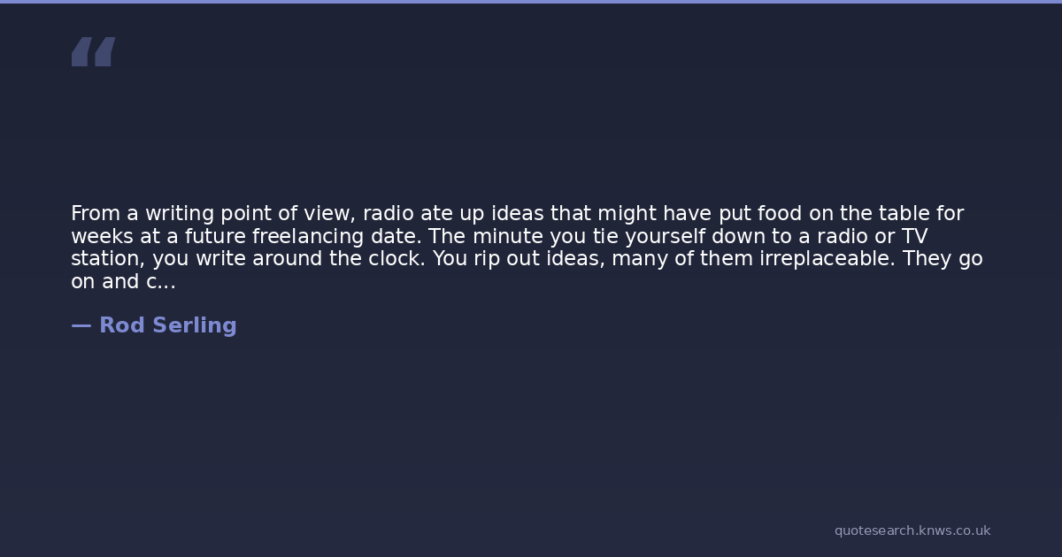 From a writing point of view, radio ate up ideas that might have put food on the table for weeks at a future freelancing date. The minute you tie yourself down to a radio or TV station, you write around the clock. You rip out ideas, many of them irreplaceable. They go on and consequently can never go on again. And you've sold them for $50 a week. You can't afford to give away ideas—they're too damn hard to come by. If I had it to do over, I wouldn't staff-write at all. I'd find some other way to support myself while getting a start as a writer.