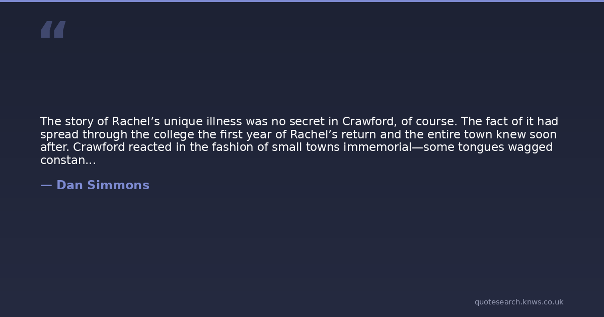The story of Rachel’s unique illness was no secret in Crawford, of course. The fact of it had spread through the college the first year of Rachel’s return and the entire town knew soon after. Crawford reacted in the fashion of small towns immemorial—some tongues wagged constantly, some people could not keep the pity and pleasure at someone else’s misfortune out of their voices and gazes—but mostly the community had folded its protective wings around the Weintraub family like an awkward mother bird shielding its young.