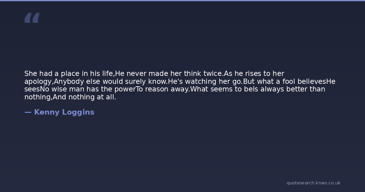 She had a place in his life,He never made her think twice.As he rises to her apology,Anybody else would surely know.He's watching her go.But what a fool believesHe seesNo wise man has the powerTo reason away.What seems to beIs always better than nothing,And nothing at all.